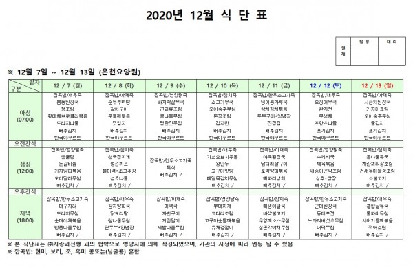 12월 둘째주 식단표 페이지 정보 작성자 은천노인복지회 작성일20-12-08 18:11 조회157,638회 댓글0건 관련링크 이전글 다음글 목록 답변 본문 . 이전글 다음글 목록 답변