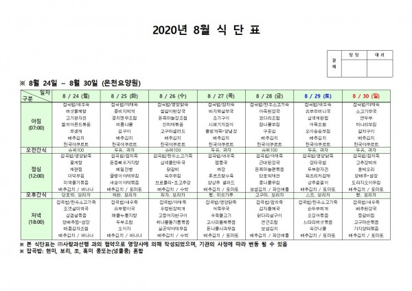8월 넷째주 식단표 페이지 정보 작성자 은천노인복지회 작성일20-08-31 16:50 조회166,496회 댓글0건 관련링크 이전글 다음글 목록 답변 본문 . 이전글 다음글 목록 답변