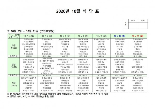 10월 둘째주 식단표 페이지 정보 작성자 은천노인복지회 작성일20-10-12 14:45 조회164,529회 댓글0건 관련링크 이전글 다음글 목록 답변 본문 . 이전글 다음글 목록 답변