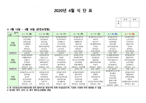 4월 둘째주 식단표 페이지 정보 작성자 은천노인복지회 작성일20-04-20 16:27 조회181,949회 댓글0건 관련링크 이전글 다음글 목록 답변 본문 . 이전글 다음글 목록 답변