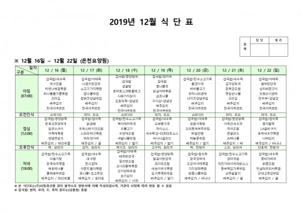 12월 셋째주 식단표 페이지 정보 작성자 은천노인복지회 작성일19-12-23 14:06 조회192,571회 댓글0건 관련링크 이전글 다음글 목록 답변 본문 12월 셋째주 식단표입니다. 이전글 다음글 목록 답변