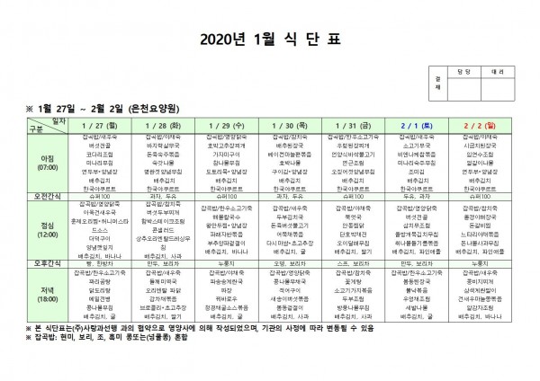 1월 넷째주 식단표 페이지 정보 작성자 은천노인복지회 작성일20-02-04 09:37 조회188,337회 댓글0건 관련링크 이전글 다음글 목록 답변 본문 1월 넷째주 식단표입니다. 이전글 다음글 목록 답변
