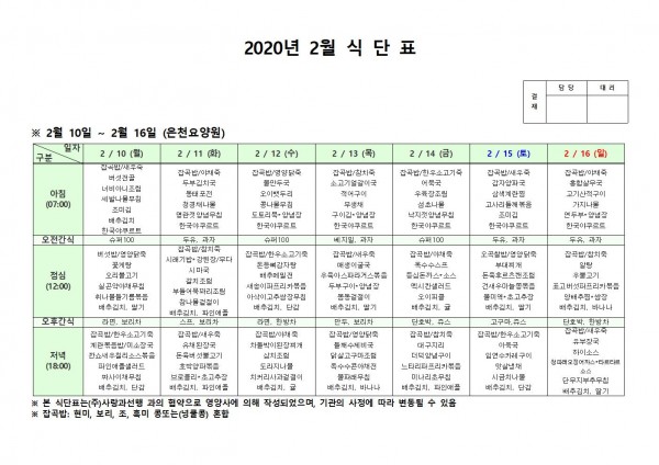 2월 둘째주 식단표 페이지 정보 작성자 은천노인복지회 작성일20-02-17 10:27 조회186,004회 댓글0건 관련링크 이전글 다음글 목록 답변 본문 ㅇㅅㅇ 이전글 다음글 목록 답변