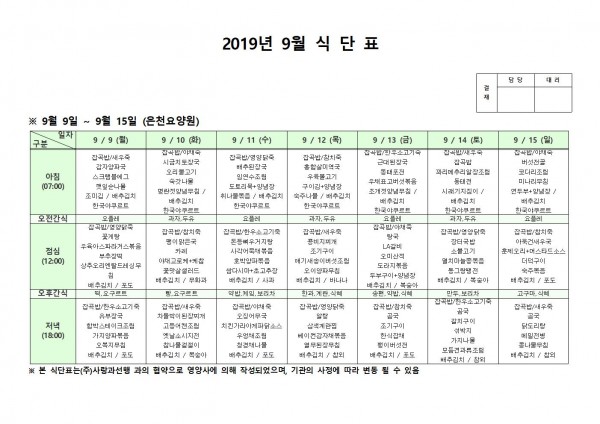 9월 둘째주 식단표 페이지 정보 작성자 은천노인복지회 작성일19-09-23 13:26 조회200,758회 댓글0건 관련링크 이전글 다음글 목록 답변 본문 . 이전글 다음글 목록 답변
