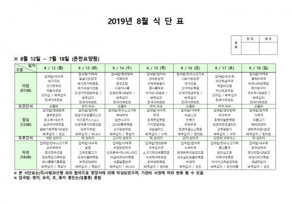 8월 셋째주 식단표 페이지 정보 작성자 은천노인복지회 작성일19-08-19 15:35 조회201,072회 댓글0건 관련링크 이전글 다음글 목록 답변 본문 8월 셋째주 식단표 이전글 다음글 목록 답변