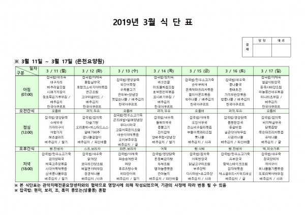 3월 둘째주 식단표 페이지 정보 작성자 은천노인복지회 작성일19-03-18 10:09 조회210,598회 댓글0건 관련링크 이전글 다음글 목록 답변 본문 3월 둘째주 식단표 이전글 다음글 목록 답변