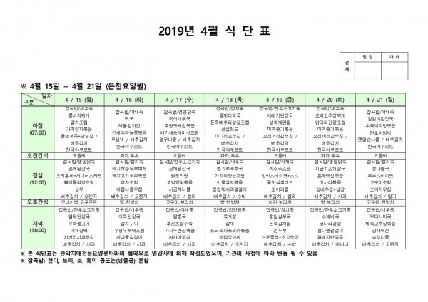 4월 셋째주 식단표 페이지 정보 작성자 은천노인복지회 작성일19-04-22 13:22 조회210,016회 댓글0건 관련링크 이전글 다음글 목록 답변 본문 4월 셋째주 식단표 이전글 다음글 목록 답변