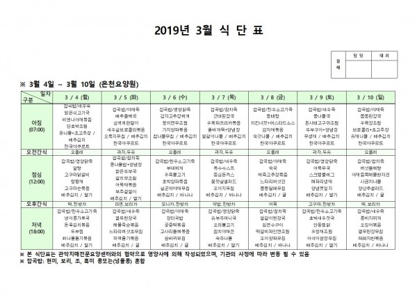 3월 첫째주 식단표 페이지 정보 작성자 은천노인복지회 작성일19-03-13 09:44 조회210,628회 댓글0건 관련링크 이전글 다음글 목록 답변 본문 3월 첫째주 식단표 이전글 다음글 목록 답변